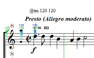 Tempoangaben werden aus Einfachtext übernommen. Einfachtexte mit dem Prefix "@tm" werden ausgewertet und als Tempoangaben an die Noten gehängt. Mehrere Tempoangaben für verschieden Durchläufe sind möglich. Diese Tempoangaben mit @tm lassen sich mit dem Skript für die endgültige Partitur verbergen oder zum Bearbeiten wieder sichtbar machen.