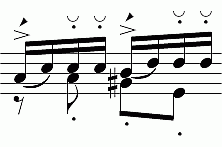 - Die Note markieren und mit Capella unter Format > Noten/Pausen > Noten > Artikulationszeichen das entsprechende Zeichen auswählen und setzen.