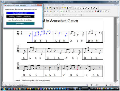 - Vorgang Wiederholen, bis die Balgrichtung für alle Noten festgelegt ist. Fälschlich markierte Stellen können durch neu markieren und »auf Zug spielen« anklicken zurückgesetzt werden.