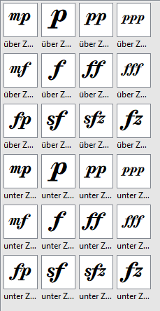 In dieser Galerie sind alle Symbole auf Gültigkeit "Stimme" gesetzt und sind für "über- " und "unter den Noten" formatiert