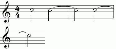 - Beide Akkorde / Noten müssen gleich sein und am ersten Akkord / Note hängt ein Bindebogen mit der Länge 0 oder 1.