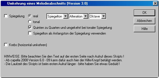 Mit diesem Skript wird ein markierter Melodieabschnitt vertikal oder / und horizontal "umgekehrt", d.h. es entsteht die Spiegel- oder / und die Krebsform des Melodieabschnitts.