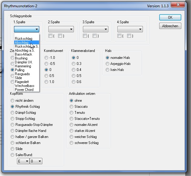 Mit diesem Skript lässt sich die Notation für Schlaggitarre umsetzen. Der wesentliche Unterschied zum Originalskript von Andreas Herzog besteht darin, dass sich die Rhythmuszeile einer Partitur auf