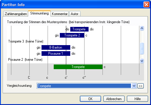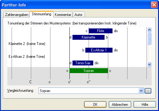 In den Partitur-Informationen zeigt Capella den Stimmumfang jeder einzelnen Stimme im Vergleich zu einer vorerfassten Tabelle an. Capella unterstützt nur eine Tabelle. Ein Wechsel ist nicht möglich.
