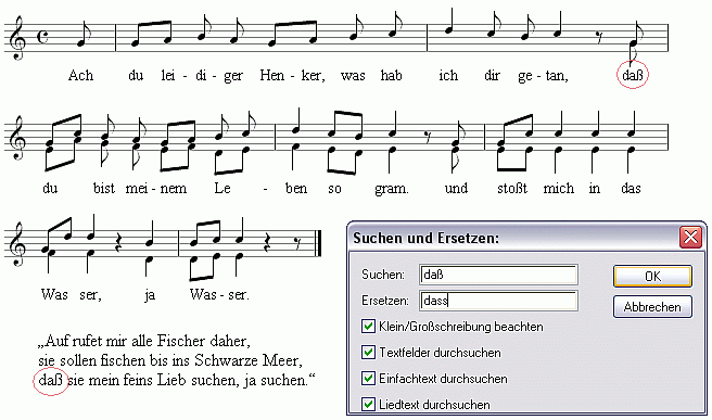 Mit diesem Skript können Wörter oder Buchstaben gesucht und ersetzt werden, somit ist es ganz einfach z.B. die Texte in einer Partitur der neuen Rechtschreibung anzupassen.