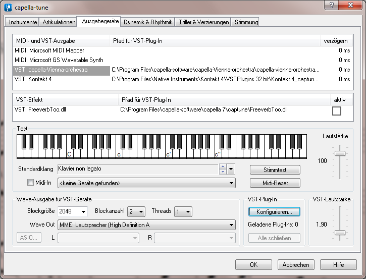 Nach Ende der Einrichtung findest Du unter captune\Ausgabegeräte\Konfigurieren und Klick auf "Einstellungen laden" diesen Dialog