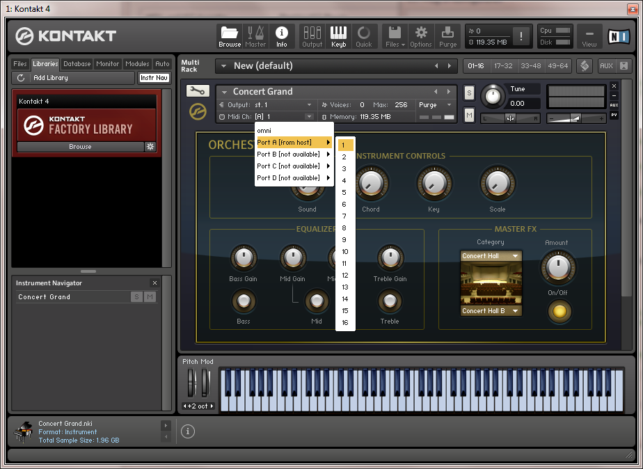 - Mit doppelklick auf „Concert Grand“ lädt Kontakt das Instrument